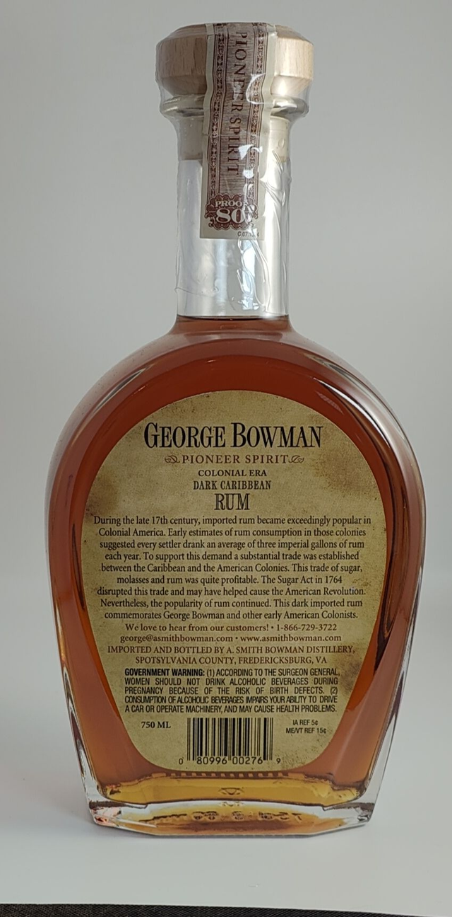 A dark Caribbean rum, bottled by the distillery A Smith Bowman, Spotsylvania County, Fredericksburg, Virginia.750ml 40%A.B.V.